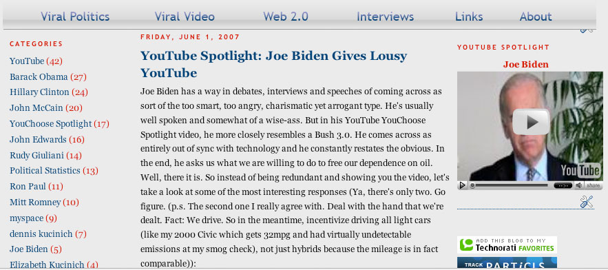 Here's my perspective. We started writing Viralroots in 2007. We stayed on topic. More than 75% of our articles are tagged, Viral Politics. What's our most blogged about, most linked to, most trafficked article of all time? The one about Dennis Kucinich's sexy wife.